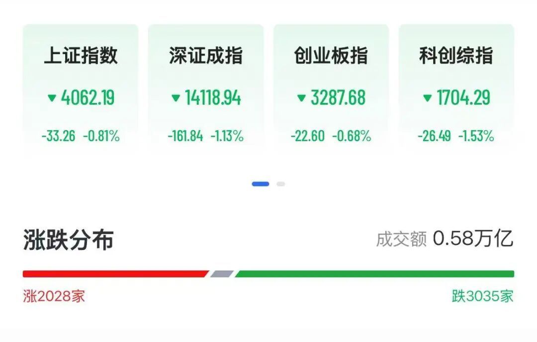 A股三大指数全线飘绿,截至发稿跌幅扩大,沪指跌0.81%,深证成指跌1.13%,创业板指跌0.68%。科创综指跌1.53%。